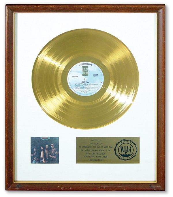 Beautiful white matte gold record award for the Eagles 1973 release, "Desperado." RIAA certified, "Presented to Don Henley to commemorate the sale of more than one million dollars" of the Eagles' second album. A memorable LP which is a chronicle of the rise and fall of the Doolin-Dalton renegades of the Wild Wild West. Award is Mint.