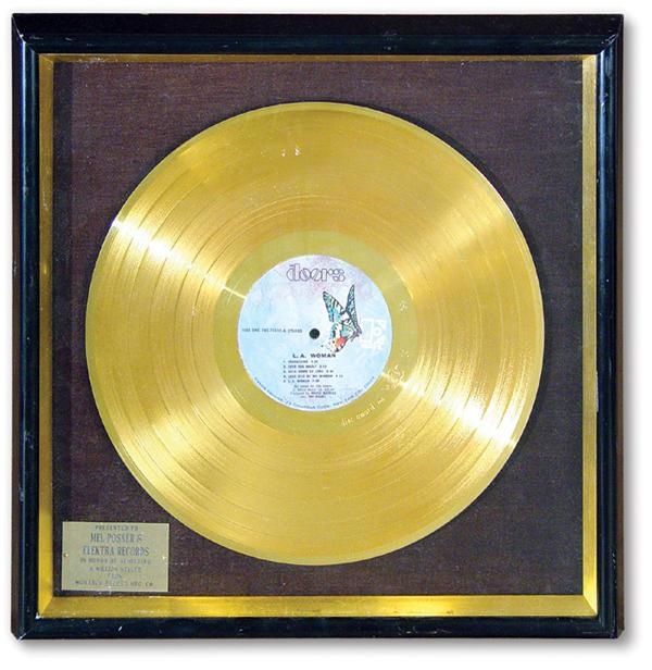 One of the more important gold record awards from these icons of rock. For the last official Doors album, "LA Woman". Gold record is Mint with small affixed gold plate in bottom left corner which reads "Presented to Mel Posner & Elektra Records in honor of achieving a million seller from Monarch Record MFG. Co."