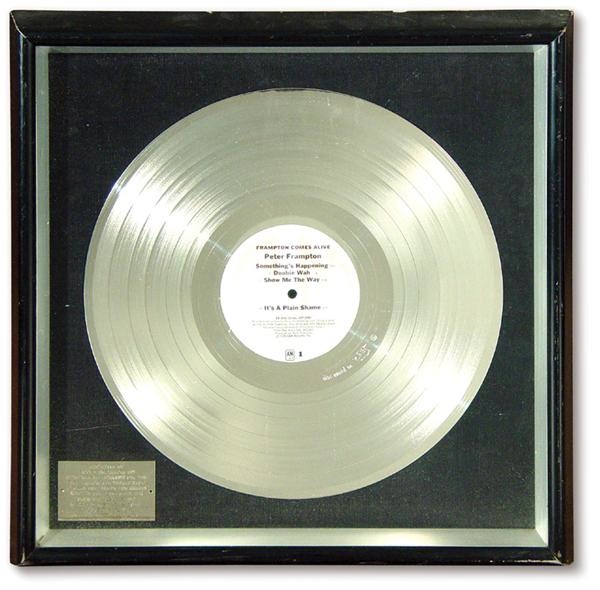 1976 Gold Record Award from Peter Frampton's "Frampton Comes Alive". Small silver plaque attached to lower left reads, "Presented to Record Merchandising in sincere appreciation for your performance and contribution toward the sale of one million units of the Peter Frampton 'Frampton Comes Alive' album and tape, A&M 3703. Congratulations, Herb and Jerry 7-30-76." Record itself is Mint.