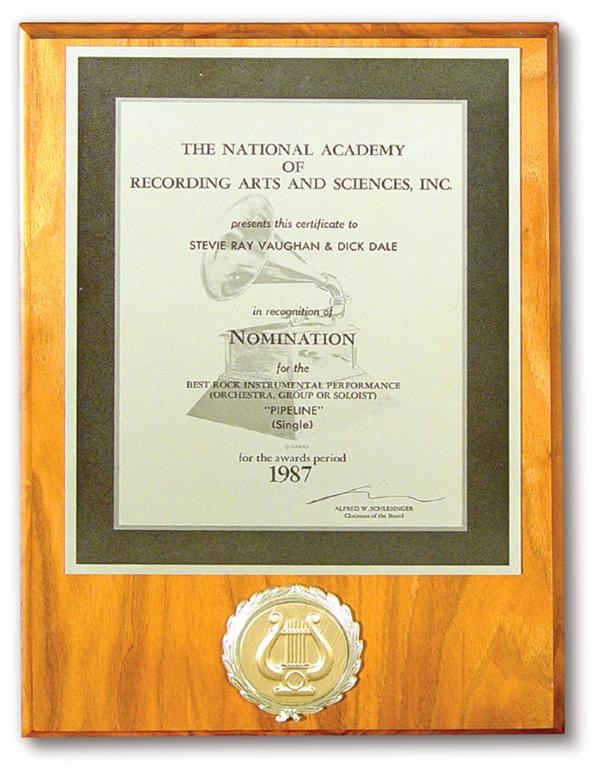 Wooden award plaque given to Stevie Ray Vaughan & Dick Dale by the National Academy of Recording Arts and Sciences "in recognition of nomination for the Best Rock Instrumental Performance (Orchestra, Group or Soloist) 'Pipeline' Single for the awards period 1987." A beautiful display piece, the affixed metal plate has the image of the Grammy award faded into the background. With this, Stevie Ray Vaughan became the first musician in history to be nominated twice for the same Grammy in the same year (the other one was for "Say What!" from Live Alive for which he did win the Grammy). NRMT condition.