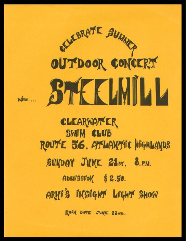 Bruce's regular gig with his early band, Steel Mill was Clearwater Swim Club, Route 36 in Atlantic Highlands. Rarely seen handbill for Sunday June 21, 1970 announces, "Celebrate Summer - Outdoor Concert with Steel Mill". 8.5x11" on yellow paper. EX.