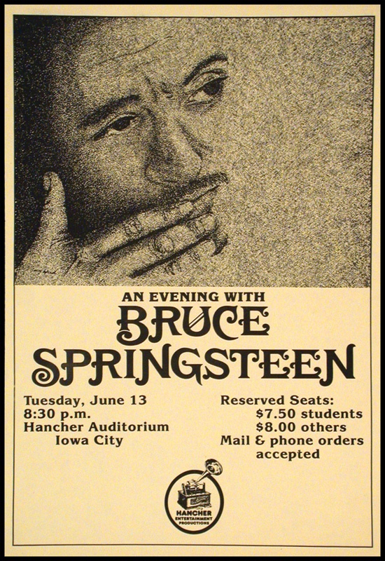Extra nice poster for "An evening with Bruce Springsteen" at Hancher Auditorium, Iowa City. Features artwork of a pensive Bruce. EX-MT except for crease in upper left corner.