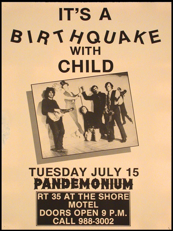 "It's a Birthquake with Child!" announces this July 15, 1969 poster. The phrase refers to the recent birth of Bruce's NJ-based band known as "Child". At Pandemonium in Asbury Park, "Rt. 35 at the Shore Motel". Large size heavy paper poster features a young Bruce in the well known early publicity still with Fred Astaire and Ginger Rogers in background. EX.