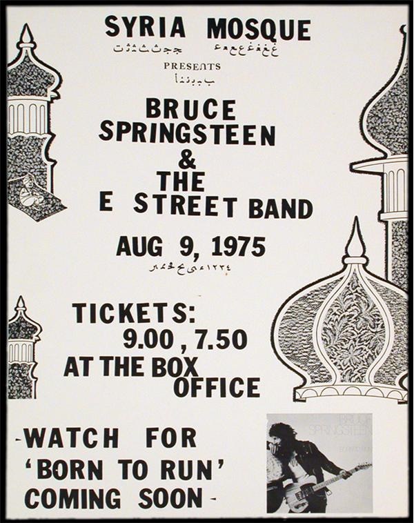 One of the most unusual Springsteen posters of all. August 9, 1975 show at the Syria Mosque is replete with onion towered temples and Arabic translations. Best of all is “Watch For ‘Born To Run’ Coming Soon” with the rare original “script cover” nestled beside. EX-MT.