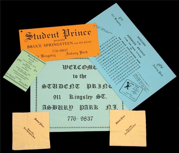 Rare group of six pieces from the early years of Bruce’s career, documenting a series of dates played by Bruce Springsteen & His Band at the Student Prince in Asbury Park in September of 1971. All refer to Bruce Springsteen & His Band unless noted. Lot consists of: 1. Advertising card (3.75x5”) – Calls Bruce “That Sensational Soul Man”. 2. Student Prince Presents Advertising Sign (5x11”) 3. Two Student Prince placemats, one does not mention Bruce, the other has a Find the Bruce Springsteen Song Titles word puzzle and a free pass to a Bruce Springsteen show you can cut out.