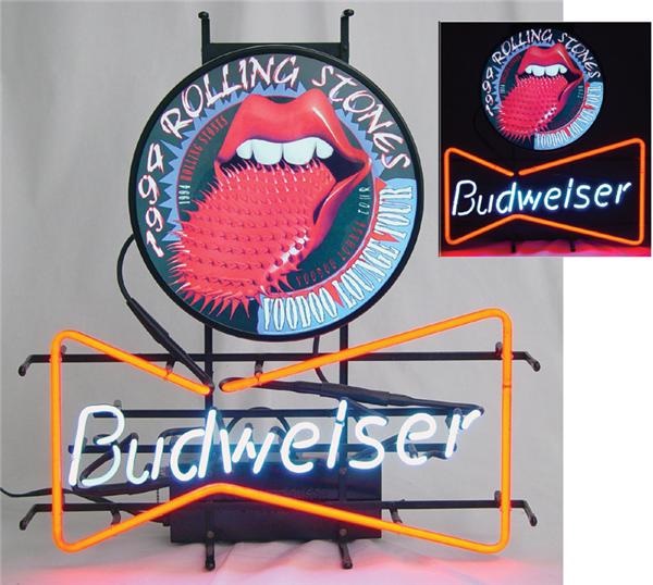 An eclectic piece for your game room. One of only a few different styles of neon light displays created to promote the 1994 Voodoo Lounge Tour. The ever popular lips and tongue logo with a twist – the tongue is covered in crimson thorns. Below the round Rolling Stones light-up sign is the “Budweiser” neon light, advertising another one of America’s most popular products. In full working condition, manufactured by Anheuser Busch. EX-MT condition. 22” wide and 24” tall.
