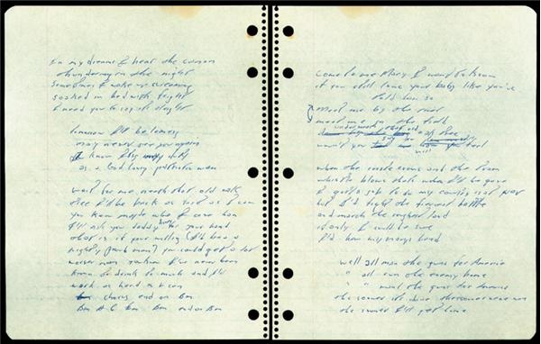 Handwritten lyrics, unsigned, unpublished for an unnamed piece written to the same Mary immortalized in Thunder Road. It dreams: "Come to me Mary I want to know if you still love your baby like you've told him so. Meet me by the river, meet me in the field underneath that old oak tree. Won't you say you will. When the rooster crows and the train whistle blows, that's when I'll be gone. I gotta job to do, my country is at war. But I'd fight the fiercest battle and march the roughest land if only I could be sure I'd have my Mary's hand. We'll all man the guns for America, we'll all run the enemy home, we'll all man the guns for America. The sooner it's done, the sooner we've won, the sooner I'll get home…[more]" On 8x10" spiral notebook paper. EX.