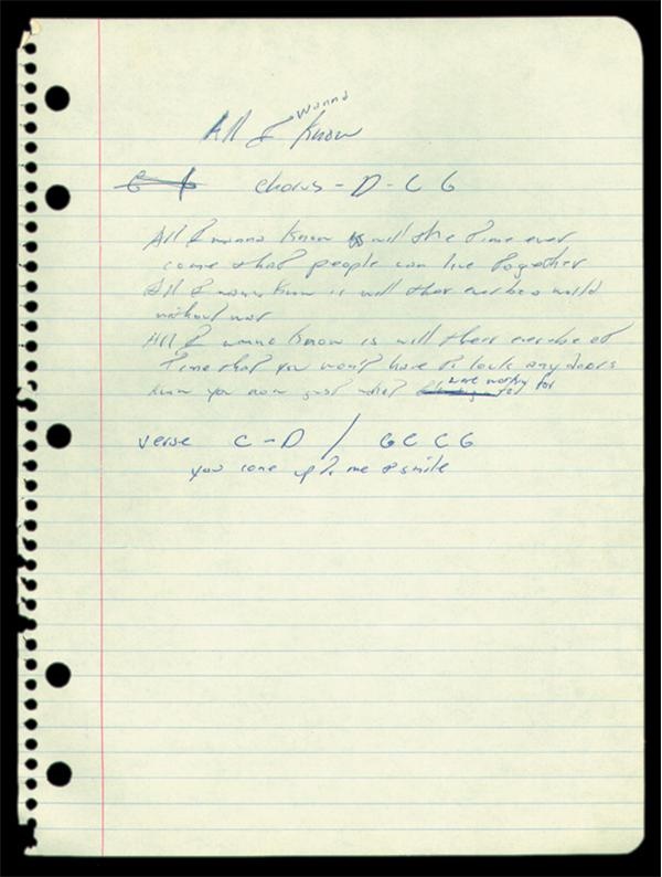 Beckoning musical exploration by the rock poet songster of his time. "All I wanna know is will the time ever come that people can live together, All I wanna know is will there ever be a world without war…". Incomplete unpublished song even includes chord changes. In blue ink on NRMT lined white notebook paper. Corrections are all in his own hand, tracking the progression of another masterpiece by this lyrical craftsman.