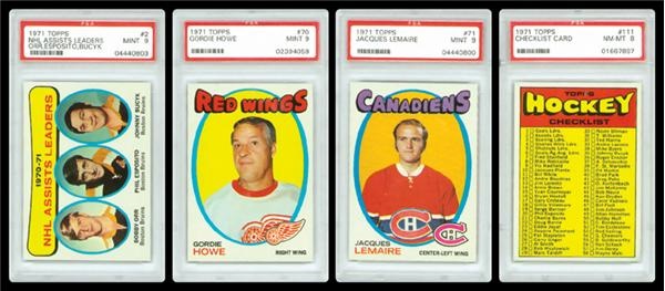 Set contains 175/176 cards, missing only a common, #62. Of those, 14 have been graded by PSA. Overall the set averages NRMT to NM-MT with three cards graded PSA 9 Mint: #2 NHL Assists Leaders Bobby Orr & Phil Esposito, 70 Gordie Howe, and 71 Jacques Lemaire. The balance of the PSA graded cards included are: PSA 9 oc- #50 Bobby Hull, PSA 8- #6 Plante & Esposito Goals-Against Avg. Leaders, 20 P. Esposito, 40 Park, 65, 97, 108, 111 Checklist, 120 H. Richard, and 125 Stan Mikita, and PSA 6- #45 Ken Dryden’s rookie. Cards have a nice gloss and appear pack fresh.