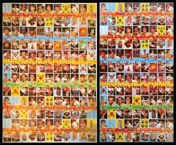 One full sheet (132) and one partial sheet (108) from the 1st series, #1-#109, filled with more stars than your favorite constellation. Highlighted by Al Kaline, Buc Blasters card, Snider & Hodges, Mantle Batting Leader card, Whitey Ford ERA Leader, Koufax Strike Out Leader, Maris HR Leader, Aaron and Musial Batting Leader, etc. The partial sheet, missing two columns of twelve cards each, is displayed in an attractive 27”x47” frame. Overall the partial sheet is EX+ having only a few small creases, which are shorter than three inches, and one small pinhole. The full sheet has a nine-inch tear in addition to some edge wear and two creased corners. Some pencil markings along the right border and discoloration to approximately twelve cards. Overall VG-EX.