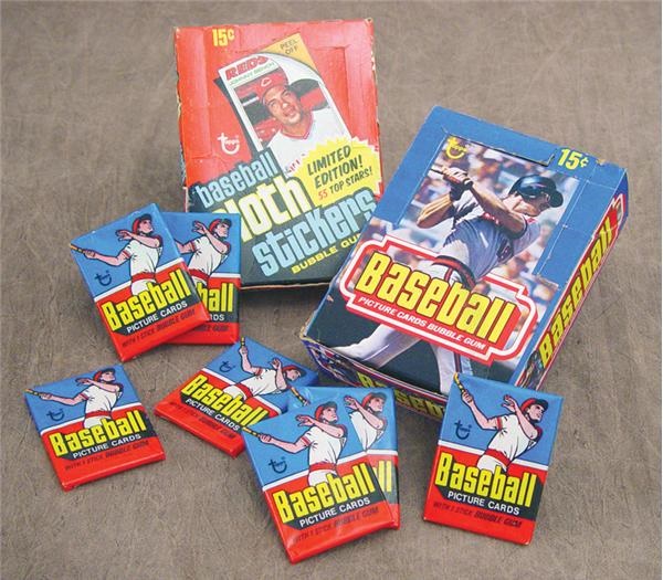 The anticipation and mystery that surrounds unopened material always gets the true collectors heart pumping and this pair is no exception. The display box (EX) holds 36 NRMT packs of cloth stickers, guaranteed to hold one of Topps few specialty issues of the late 70’s. 2 cards per pack. The other wax box (EX) with 36 NRMT packs of its own hides the likes of Carlton, Schmidt, Yaz, Rose, Seaver, Winfield, etc. 10 cards per pack. These two sensational sealed offerings, the perfect investment.