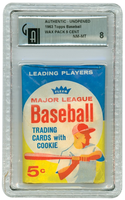 Gum? Everybody does gum! In 1963 Fleer defied the industry norm and included a tiny baked good in place of the bubblegum and now Lelands is proud to offer the most delicious specimen available in the hobby. This extraordinarily rare pack has deservedly been graded NM-MT ‘8’ by GAI, with none graded higher. Inside its attractive, boldly colored wrap is a cookie that has remained 100% in tact for over forty years. Other packs have surfaced with their contents broken or crumbled but this is one exceptional instance that has survived unscathed. Certainly this is one 5-cent wax pack and cookie that’s going to be worth a fortune.