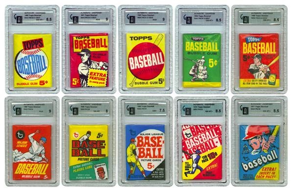 Imagine taking all of the nickels and dimes you earned as a kid and buying as many packs of baseball cards as you could afford. Then for a second, think about socking them away and saving them for 40 years. This near miracle is the result-An unbelievable 1960’s, high-grade unopened pack run lacking just a 1962 and ’66 pack. All (14) are Topps baseball packs from 1960 to 1973. The following wax packs have all been graded by GAI, Global Authentication, 1960 2nd Series GAI “8.5 NM-MT+, 1961 GAI “9 Mint, 1963 6th Series GAI “9 Mint, 1964 “8.5 NM-MT+, 1965 1st Series “8.5 NM-MT+, 1967 3rd Series GAI “9 Mint, 1968 4th Series “8 NM-MT, 1969 “7.5 NRMT+, 1970 “8.5 NM-MT+, and a 1971 “8.5 NM-MT+. Also included is a 1963 Penny pack, ’69 Poster pack, ’72 pack, and a ’73 2nd series pack, which average NM-MT. Perfect for investment. Truly an unopened dream.