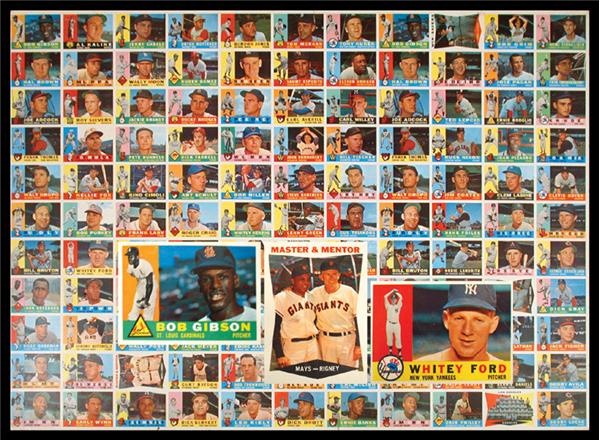 Sheet is from the 1st series containing cards numbered 1-110 for a total of 121 cards on the sheet. It features a plethora of stars such as Bob Gibson twice, Al Kaline, Whitey Ford, Brooks Robinson, Master & Mentor (Mays/Rigney), Ernie Banks, Dodgers Team Card, Nellie Fox, Elston Howard, and Early Wynn. There is creasing through most of the stars. Additionally, the Ernie Banks has paper loss. Overall the sheet technically grades VG-EX because of creasing but presents stronger. A tremendous display piece to accompany your 1960 Topps set.