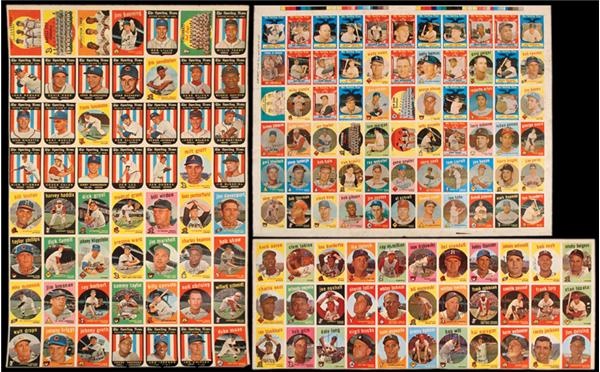 Good things do come in small packages. From 1959 Topps comes four different uncut sheets, varying in the number of cards per sheet. A 5th Series sheet, containing numbers (380-440) of thirty-three cards features Frank Robinson’s 2nd year, Hank Aaron, Bill Mazeroski, and Orlando Cepeda. Significantly creased with a single crease in the middle running top to bottom. The second sheet is a sixty-six card hi-numbered (507-572) uncut sheet with superstars galore! Bob Gibson and Norm Cash rookie cards. All-star cards from Mantle, Aaron, Fox, Aparicio, and Mays. The hard to find “Symbol Of Courage” Campanella card and “Corsair Outfield Trio” with Clemente. Two significant creases both left to right across the length of the sheet. One through the center row on top. The third is a 2nd Series sheet of forty-four cards, containing numbers (111-185). Featured are Musial, Cubs’ Clubbers w/ Banks, and many of the Sporting News Rookie Stars of ’59. Sheet is VG-EX to EX. The last sheet is also a 2nd Series sheet, featuring Cubs’ Clubbers amongst the other 55 cards. Sheet is water damaged and creased.