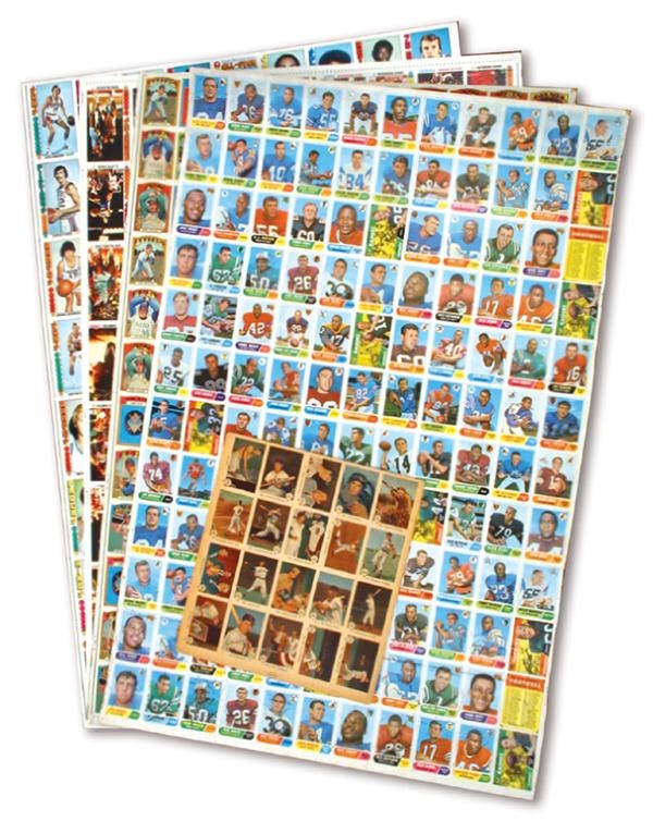 Six different uncut sheets from three different sports are included in this lot. 1959 Fleer Ted Williams 20-card uncut sheet. Sheet grades VG-EX with light creasing and corner wear. 1961 Fleer football Series 2 uncut sheet. The short-printed Jack Kemp is the feature while other highlights include George Blanda twice, Jim Otto’s rookie twice, and Don Maynard’s rookie twice. 132 cards total. Overall VG-EX because of heavy creasing. Two different 1976/77 Topps basketball uncut sheets with 72 cards each. Both sheets together comprise a complete set of 144 cards. Sheets feature Kareem, Dr. J, Maravich, Walton, etc. and average NRMT. 1972 Topps baseball Series 5 uncut sheet is a full sheet of 132 cards. Pete Rose twice, Al Kaline twice, and various award cards highlight the sheet. VG-EX. 1968 Topps football 2nd Series uncut sheet of 132 cards. Sheet features Brian Griese’s Rookie twice, Ditka twice, Kemp, Blanda, Alworth, etc. Good to VG. An interesting mix of some desirable uncut goodies.