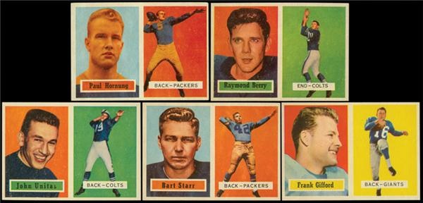 This fantastic Topps issue includes rookie cards of some of the greatest players in NFL history. The great dual image card features both a close-up portrait of the player and an action photo. The keys in this set grade as follows with many commons grading NM-MT: #1 Eddie Lebaron EX-MT+, #30 Y.A. Tittle NRMT, #31 George Blanda NRMT, #32 Bobby Layne NRMT+, #85 Dick Lane (RC) NRMT, #88 Frank Gifford NM-MT, #94 Ray Berry (RC) VG-EX (small crease), #104 Earl Morrall (RC) NM-MT, #119 Bart Starr (RC) NRMT, #128 Lenny Moore NM-MT, #138 Johnny Unitas (RC) NM-MT, and #151 Paul Hornug EX-MT+. And don't forget, this set also includes a Penny Pack wrapper, a Nickel Pack wrapper, the unnumbered short printed checklist (marked), a Felt Initial Card in NRMT condition, and one unopened Penny Pack with gum!
