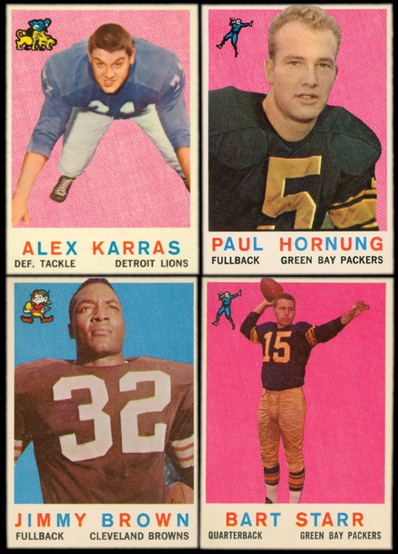 Set is led by big #32, Jim Brown’s 2nd year card (NRMT). Complete at 176 cards. Rookies in the set include Sam Huff (NRMT, oc), Alex Karras (NM-MT), Jerry Kramer (NRMT+), Bobby Mitchell (NRMT), and Jim Taylor (NRMT, oc). Stars are as follows: Unitas (NRMT, o/c), Gifford (NRMT, o/c), Starr (NRMT), and Hornung (NRMT). Set averages NRMT. Also included are two different penny wrappers and a nickel wrapper from 1959.
