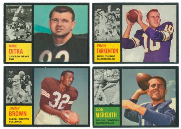 One of the most condition sensitive football sets ever issued. The black borders from the 1962 set chip easily and finding these cards in conditions better than EX is uncommon. This very consistent set averages EX-MT to NRMT and the keys grade as follows: #1 Johnny Unitas EX, #17 Mike Ditka (RC) NRMT, #28 Jim Brown EX-MT to NRMT, #36 Ernie Davis (RC SP) EX+, #39 Don Meredith (SP) NRMT, #63 Bart Starr EX-MT+, #64 Paul Hornung EX-MT (oc), #66 Jim Taylor (SP) EX-MT, #76 Checklist EX-MT, #90 Fran Tarkenton (RC SP) NRMT, #104 Frank Gifford NRMT, #176 Checklist EX-MT+. There's also an original wrapper to make this set complete!