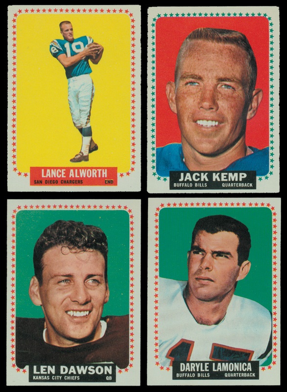 The set is somewhat difficult to complete as it contains a number of short-prints. 176-card complete set. Stars include: #30 Kemp (NRMT), 31 Lamonica rookie (NRMT), 68 Blanda (EX), 82 Checklist (EX-MT), 90 Bobby Bell rookie (NM-MT), 92 Buchanan rookie (NRMT), 96 Dawson short-print (NRMT), 121 Maynard (NRMT), 155 Alworth (NRMT+), 159 Hadl rookie (NRMT+), and # 176 Checklist (EX-MT). Set averages a strong EX-MT to NRMT with NM-MT cards throughout. Three 1964-nickel wrappers and sixteen different '64 pennant stickers are also included.