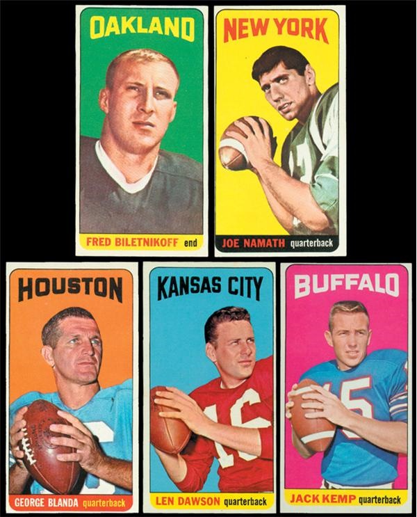 This classic Topps Tall Boy Set from 1965 includes an original wrapper, 30 of the Magic Rub-Off inserts, and all 176 retro, oversized cards in an average condition of Near Mint. A few of the keys in the set grade as follows: #1 Tom Addison (SP) EX-MT, #3 Nick Buoniconti NRMT, #35 Jack Kemp (SP) NM-MT (oc), #46 Willie Brown (RC SP) NRMT, #69 George Blanda (SP) NRMT, #87 Checklist EX-MT, #99 Len Dawson NRMT, #122 Joe Namath (RC SP) NRMT (oc), #133 Fred Biletnikoff (RC SP) NRMT, #137 Ben Davidson (RC SP) NRMT, and #155 Lance Alworth NRMT (oc). Both checklists are unmarked. A great set to add to your collection or to break up for show or store stock. This issue is always popular and the short prints sell themselves!