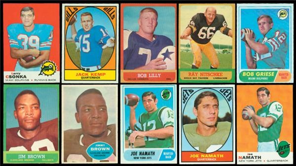 The ’60 set averages EX-MT to NRMT. Set is complete at 132 cards. Stars include: #1 Unitas (VG-EX), 23 Jimmy Brown (NRMT), 51 Starr (EX-MT), 54 Hornung (EX-MT), 74 Gifford (NRMT), 93 Layne (EX-MT), and 113 Tittle (EX-MT). Set also comes with a nickel wrapper and (3) penny wrappers. The ’63 set averages NRMT. Complete 170-card set. Stars include: #1 Unitas (EX), 14 Jimmy Brown (NRMT), 44 Deacon Jones (NRMT), 62 Ditka (NRMT, oc), 74 Meredith (NRMT), 82 Lilly (NRMT), 86 Starr (NM-MT, o/c), 96 Nitschke rookie (NRMT), 98 Tarkenton (NRMT, oc), and # 170 Checklist (EX+). Set also comes with a nickel wrapper. The ’67 set averages NRMT. 132-card set. Major stars are as follows: #24 Kemp (EX+), 59 Checklist (NRMT), 61 Dawson (NM-MT), 98 Namath (NRMT), 106 Biletnikoff (EX-MT+), and 132 Checklist (EX-MT). Set also comes with (4) nickel wrappers. The ’68 set averages NRMT. Set has 219 cards. Major stars and rookies are as follows: #1 Starr (NRMT, oc), 65 Namath (NRMT, oc), 75 Sayers (NRMT), 100 Unitas (NRMT), 149 Jack Kemp (NRMT) and #196 Griese rookie (NM-MT, o/c). Set also comes with (4) nickel wrappers. The ’69, is complete at 263 cards. It averages EX-MT to NRMT. Includes: #25 Unitas (EX-MT), 26 Piccolo rookie (EX+), 51 Sayers (NRMT), 100 Namath (NRMT+), 120 Csonka rookie (NRMT), and 215 Starr (EX+). Set also comes with (4) ten-cent wrappers. Lot also comes with complete sets of the following Topps subsets: 1960 Team Emblem Stickers (NRMT), ’67 Comic Pennants (missing 4) (NRMT), ’68 Posters (NRMT), and ’70 Posters (NRMT). Fantastic offering of EX-MT to NRMT or better football sets.