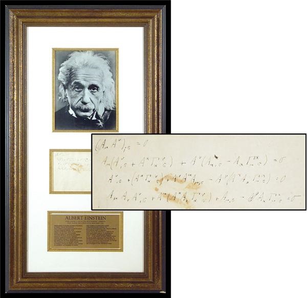 The genius at work. Four line formula entirely in Einstein's hand was deciphered by Professor of Physics B. Sinkovic of the University of Connecticut and found to be part of his Derivation of General Relativity, which is a support of the "Big Bang" theory. It was acquired from the estate of Peter A. Buckey, an Einstein biographer who was the Nobel Laureate's driver and young friend. Page is touched by a fairly unobtrusive 1.5" stain, but all writing is very legible. A fascinating look into one of the greatest minds in human intellectual history. Professionally matted and framed beneath a photo of Einstein. 17 x 23, framed.
