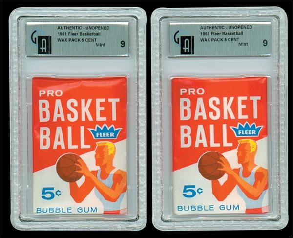 The Logo and The Stilt, Big “O” and Big “E” with so many legendary rookies packed into this pair you can’t go wrong. Two unopened and unparalleled packs from the most highly sought after set of basketball cards in existence. Still not convinced, add in first year phenom Lenny Wilkens and final regular issued cards from Russell, Cousy and Pettit. Four decades have had no effect on these ultra-clean wax packs that are bursting with bright color.
