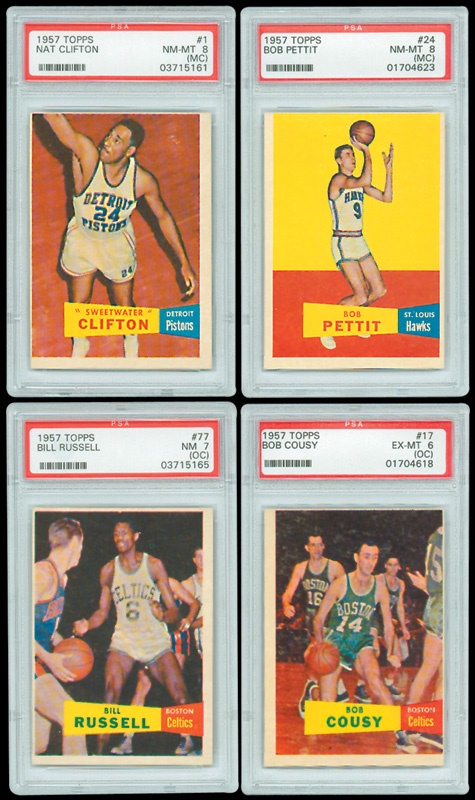 Two of the cornerstones of the Celtic dynasty are just a couple of the rare ‘rookie’ gems that await you within this remarkable near PSA graded set. Twenty-two PSA 8 include: #1 Nat Clifton (PSA 8 mc), #16 Dick McGuire (PSA 8 oc), #24 Bob Pettit (PSA 8 mc), #26 Gene Shue (PSA 8 mc), #27 Ed Macaveley (PSA 8 oc), #33 Lary Costello (PSA 8 mc), #37 Cliff Hagan (PSA 8 mc), #44 Tom Gola (PSA 8 oc), #48 Lennie Rosenbluth (PSA 8 oc), #56 Bob Houbreys (PSA 8 oc), #62 Harry Gallatin (PSA 8 mc), #71 Jack Twyman (PSA 8 mc), #73 Jim Paxon (PSA 8 oc), #74 Bob Leonard (PSA 8 oc). Thirty-three PSA 7, one without qualifiers, include: #3 Neil Johnston (PSA 7 mc), #5 Bill Sharman (PSA 7 mc), #13 Dolph Schayes (PSA 7 mc), #19 Tom Heinsohn (PSA 7 mc), #28 Vern Mikkelsen (PSA 7 oc), #32 John Kerr (PSA 7 oc), #42 Maurice Stokes (PSA 7 oc), #75 Andy Phillip (PSA 7 pd), and #77 Bill Russell Rookie (PSA 7 oc). Five PSA 6 cards, one without qualifiers highlighted by #10 Paul Arizin (PSA 6 mc) and #17 Bob Cousy (PSA 6 oc). Two PSA 5 cards, one without qualifiers, including #80 Dick Schnittker (PSA 5). Lastly, there are three PSA 4, all without qualifiers, with #4 Carl Braun (PSA 4) and #12 Slater Martin (PSA 4). High-grade examples of this set are few and far between, an attractive assortment such as this warrants serious consideration.