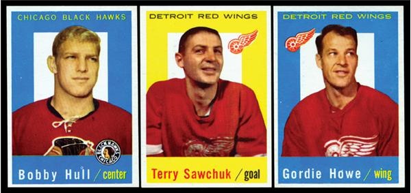 Attention to centering appears to be the focus of this classic Topps Hockey set. Thumbing through the Hall of Famers that dominate this set, it's easy to fall back into the era of wooden sticks, no helmets, no masks, and only one assist per goal. The key cards in this set grade as follows: #42 Terry Sawchuk EX-MT to NRMT, #47 Bobby Hull NRMT, and #63 Gordie Howe NRMT+. Don't miss out on this last of the great 1950's hockey issues.