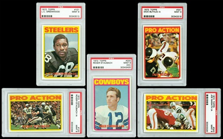 Topps best football issue of the 1970's. The elusive high numbers make this set challenging to complete. Set averages a strong NRMT to NM-MT with Mint cards scattered throughout the set. High numbers are equally as nice if not stronger. We had thirty-one of the cards graded by PSA. Highlights include: (9) PSA 9's- #18, 101 L.C. Greenwood, 122 Staubach In Action, 200 Staubach Rookie "9 oc, 316, 331 M. Morris, 336, 341 Butkus In Action, and 343 Joe Namath In Action. (19) PSA 8's- #13 Riggins, 55 A. Manning, 93, 120 Bradshaw In Action, 126, 251 Unitas In Action, 270, 280 Lilly All-Pro, 283, 287, 291 Spurrier Rookie, 294 Checklist, 322, 334, 338 Spurrier In Action, 339, 340 Len Dawson In Action, 342, and 348 Blanda In Action. Joe Namath, #100, is a PSA 7. A spectacular example of a high-grade ’72 Topps football set.