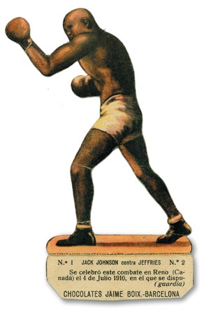 A long lost Jack Johnson card originating from Spain. From a box of chocolates no less! Bottom of card reads “Chocolates Jaime Boix.-Barcelona”. Verbiage dictates a fight between #1 Johnson and #2 Jeffries on July 4, 1910. Die-cut card has been folded at its tab. Pencil markings on verso. VG.