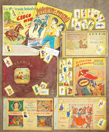 All are Cuban card albums. Captain Marvel card album is the highlight of the group. Filled with only a small amount of the 200 cards needed for a complete set. Cards and album are VG-EX. Adventures of Buffalo Bill card album. 96 card set, all cards are glued in the album as this was the original intention. Cards and album are EX. Snow White and the Seven Dwarfs card album. The 100-card set is glued in the album. Cards and album are EX. Snow White and the Seven Dwarfs card album, 2nd series. Card numbers, 101-200, are the cards glued in the album. Cards and album are EX. There is a blank card album of the Cisco Kid with the Red Dragon. EX. Youth in Danger card album was produced for a show that appeared on CMBF television. Album is mostly blank. EX. Picture album of Movie Stars shows the actors/actresses of the time on big glossy pages. VG-EX. There are (47) cards from an apparent 220-card Cuban nonsports set. Borders are yellow and feature some Disney characters and other comic/cartoon characters, which average EX. There are eight Spanish uncut Disney strips which include classic Disney characters like Mickey Mouse, Minnie Mouse, Walt Disney, Betty Boop, Snow White & the Seven Dwarfs, Pluto, Goofy, & more. Strips are VG and curled from being rolled. Also included is a Lone Ranger card album (75% full), and an empty Tarzan card album. Both are EX. A very unique selection of early Cuban nonsports card material.