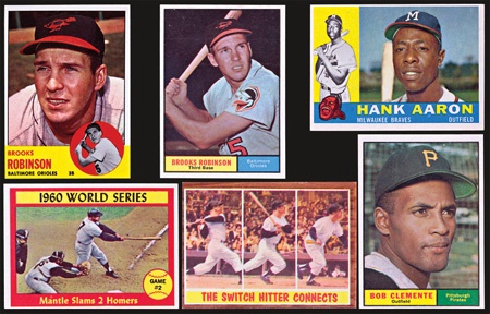 Fantastic collection of 1960’s Topps baseball cards. 1961 Topps (428): Near complete set is highlighted by Clemente, Mantle World Series, Mantle 565’ Homerun, Musial, Brooks Robinson, Mays All-Star, Marichal Rookie, McCovey, etc. 1962 Topps (524): Near complete set is highlighted by Killebrew, Mantle In Action, Aaron All-Star, Yaz, F. Robinson, Twins short-print, Schoendienst, etc. 1963 Topps (412): Near complete set is highlighted by Brooks Robinson, Pride of N.L. (Mays/Musial), Bob Gibson, Tresh short-print, Killllebrew short-print, Snider, Fox, Drysdale, etc. 1960 Topps (210): The only group with really any duplication. Highlighted by Aaron, Podres, Brooks Robinson, Wynn, and the Dodgers Team Card. 1967 Topps (66): Only minor stars highlight this group. Total of 1,640 cards, virtually no duplication in the entire group. There are a good mix of high-numbers and short-prints throughout the collection. Grouping averages a strong EX-MT to NRMT with some NM-MT examples throughout. Perfect for set-builders or for dealer inventory because there is a ton of break-up value. The condition will not disappoint!