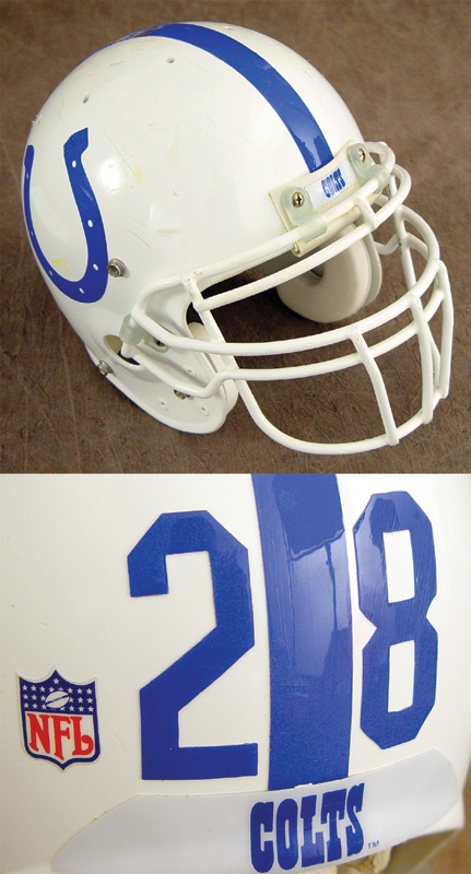 To even say that Marshall exploded onto the scene in 1994 would be an understatement. The man was an offensive juggernaut from day one and hasn’t slowed down since. Presented is the Air helmet worn during that sensational rookie campaign. A single blue stripe separates the two Colts’ horseshoe logos that adorn each side on the surface of the pure white paint. “28” flanks the striping in blue above a “Colts” back bumper sticker. To the left is an NFL shield. The white face mask, which was in the ’94 season until the team made the switch to blue in ’95, is consistent with those used by Faulk throughout his career. The use of this helmet was tremendous with scuffs, scrapes, and field markings covering the outer shell and sweat toned padding on the inner padding. A spectacular piece from the game’s premier offensive player.