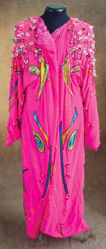 This outlandish and colorful costume robe was worn by Eric Carr. Full length robe made of a light purple colored fabric. Shoulders and top of back is adorned with numerous beads, giving this classic a completely over-the-top presence. From the collection of Gene Simmons and KISS via the Greg Manning KISS auction.