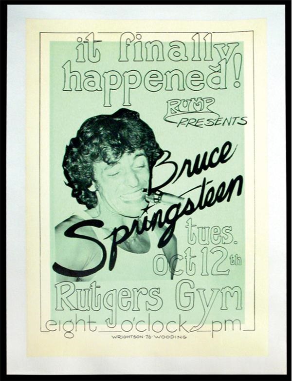 Linen-backed poster advertised Bruce’s appearance when he descended upon the Rutgers University campus in New Brunswick on October 12, 1976. Great photo of a performing Springsteen is surrounded by the announcements, “It Finally Happened! Rump presents Bruce Springsteen tues. oct 12th Rutgers Gym eight o’ clock pm”. EX-MT.