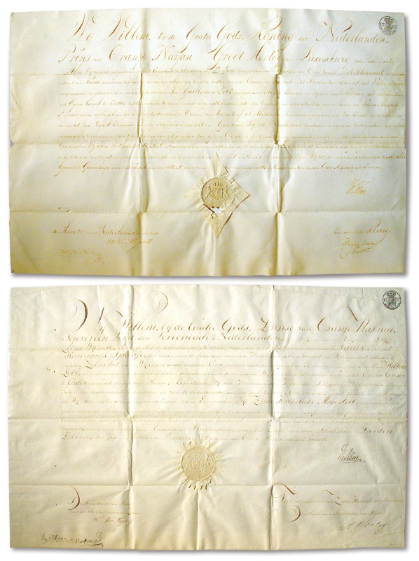 Two un-translated Dutch Documents from the House of Orange Nassau, a.k.a. the Dutch Royal House. In 1813, when the Netherlands became a kingdom, Prince Willem of Orange ascended the throne. These documents were signed and issued soon after in 1815 and 1820, respectively. Documents are made of animal hide, which feels like a heavy parchment. Each document measures 15x23” and carries the seal of the Prince of Orange and the Kingdom of Holland. EX- MT.