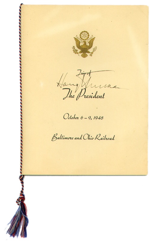 Program is a dinner menu, care of the "Baltimore and Ohio Railroad". Signed in black fountain pen on the cover after he completed his first term as Presient. Cover reads "Trip of The President October 6-9, 1948 - Baltimore and Ohio Railroad" with raised gold American Eagle seal. EX-MT.