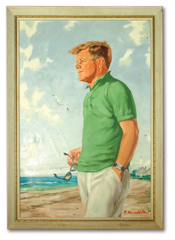 Classic oil-on-canvas of our 35th, and most beloved President. A native of New England, JFK is pictured looking out from the shore of Cape Cod, Massachusetts, his favorite sanctuary. Created by R. Mondello in 1965, painting is in Excellent condition. Measures 24x36” and sits in wooden frame (28x40”). Some spotting, but displays nicely. This is a famous picture that was used to make prints sold in the New England area for many yaers. This is the original painting obtained directly from the original artist.