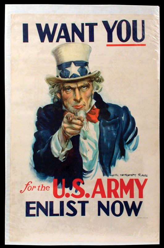 The greatest, most widely recognized symbol of American patriotism is this image of Uncle Sam taken from James Montgomery Flagg's 1916 painting. Print on linen was created in an effort to again pique the conscience of Americans during WWII and to incite the youth to enlist in the Army. NRMT condition. Framed to 30x42".