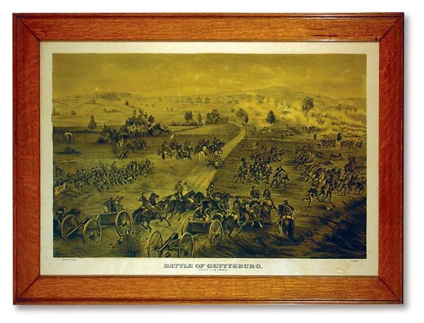 Moving print of the Civil War battle that birthed Lincoln’s unforgettable address. Huge lithograph sits in its original wood frame. Reads at bottom, “Battle of Gettysburg July1-3, 1863” in bold letters of glory. In fine type, “Printed by T.B. Enzel…EVC Gelderd.” Some creasing, overall very good. Produced some time after the battle, likely in the 1880s.