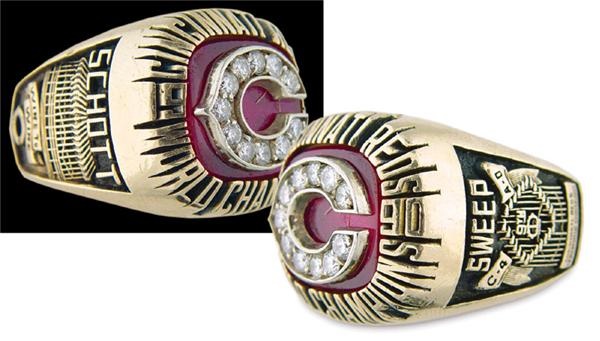 Commemorating one of the most shocking sweeps in World Series history, this 1990 Cincinnati Reds World Series Ring was made for family member, Steve Schott. 10 karat gold stunner with 11 diamonds forming a "C" on top of red stone, surrounded by "1990 Cincinnati Reds World Champions" on raised lettering. Left shank is "Schott Wire to Wire" with Cinergy Field Stadium. Right shank is "Sweep - C-4, A-0"… "Cincinnati Reds World Champions" and World Series trophy. Size 10 by Cabin (Schott had a few of these made for friends). Excellent condition.