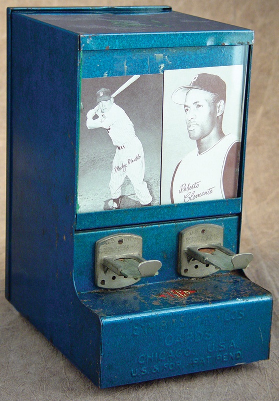 With Mantle and Clemente in the window of this vintage Exhibit vending machine, what kid wouldn't feed it a penny? This relic will take you back to a simpler time. The Exhibit Supply Co. commonly sold their cards in penny vending machines. Missing one of the four replaceable rubber knobs on the bottom, o/w EX. Produced in the 1950s but used up until the 1960s.