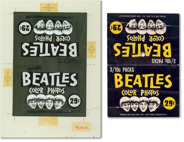 This one of a kind paste-up artwork comes straight from TOPPS gum card company with their stamp on the verso. Used to manufacture and print the 3 for ten-cent color photo Beatles card packs. Included is the header card this was used to print. Art includes all original details and notes. True one-of-a-kind! Measures 10x11.5”. EX.