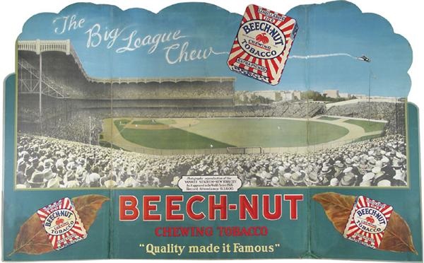 Tremendous tri-fold advertising sign pairs America's two great passions: baseball and chewing tobacco. They couldn't have picked a more imposing sight to help market this tobacco product. It is the unmistakable massive expanse of Yankee Stadium's center field, which is seemingly endless. Right field still looks tantalizingly short though, and that's a good thing, because one can easily recognize the Babe at the plate, ready to drop one into the photographer's lap. Typical wear for a piece of this age give this rarity a technical VG grade, although this belies the overall eye appeal of this great piece. If this isn't the thing that catches the most eyes in your trophy room, then you must have a lot of great stuff. Colors and details are absolutely captivating. In terms of size and intrigue, few pieces can beat this.