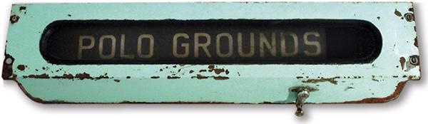 Destination: The Polo Grounds. Authentic piece salvaged from a New York City bus. This is the sign in the front of the bus that the driver revolved to show the destination. Brass crank still works and allows to show key stops like Grand Central, Times Square and most importantly the “Polo Grounds.” The stops are stenciled in white on a black cloth that feeds through a gear mechanism. Green metal plate covering with glass window front takes you on the ultimate tour through Gotham. Would make a most amazing display.