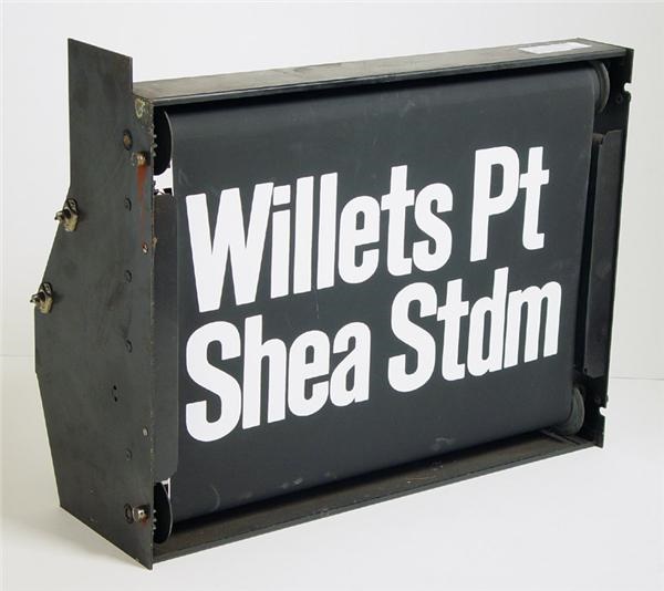 Removed from the front of a bus that ferried Mets fans out to this Queens ballpark. Who knows, this may be from one of the vehicles that was operating during that glorious summer of '69 when the Mets ruled the universe. Either way, it'll look great in your trophy room by your Mets jerseys, bats and balls. 22x16x6” and works perfectly to show all the stops of New York in its day.