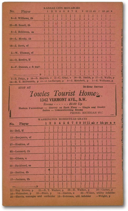 This is one of the best Negro League scorecards extant, boasting the very finest Negro League line-ups ever assembled. This unscored card (9.5x11”) in excellent condition boasts the line-ups for the Negro League Champion Kansas City Monarchs, Philadelphia Stars, Washington Homestead Grays & the Birmingham Black Barons. The Monarchs line-up included some of the greatest players in the history of professional baseball. Includes superstar Jackie Robinson, who got his professional start filling in at the shortstop position for the war-depleted Monarchs team. It was there that Jackie would be discovered by Branch Rickey, who signed him to the Brooklyn Dodgers the following year. Also listed are Satchel Paige, J. Williams, & H. Smith. The Homestead Grays line-up includes Bell, Leonard & Josh Gibson.