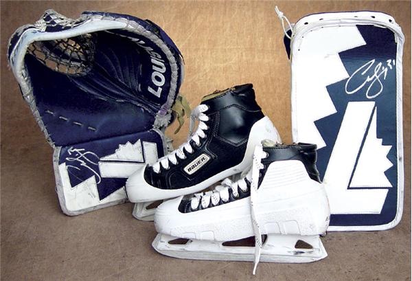 Superstar Curtis Joseph is still one of the league’s elite netminders. The future Hall of Famer has offered up this fabulous collection of his game used equipment: 1. Louisville TPS blocker with in scripted “CUJO” on the thumb. 2. Louisville TPS catcher, in great condition, also sports “CUJO” on the thumb. 3. Bauer goalie skates in nice condition. All articles show good game use. Blocker & catcher are both signed.
